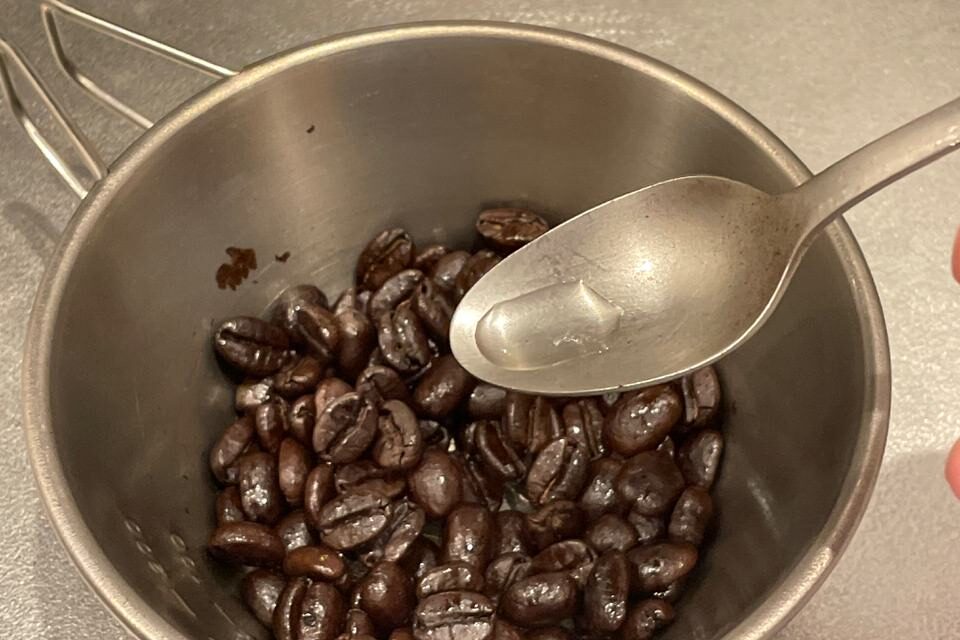 スプーンにスイカの種くらいの水を垂らして、コーヒー豆になじませる作業をします。